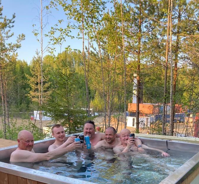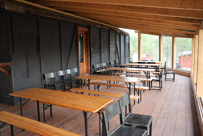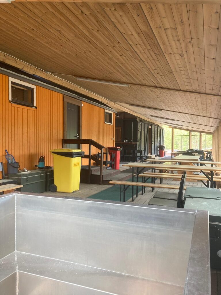 Alueella sijaitseva sauna- ja ruokajuna mahdollistaa suurtenkin tapahtumien muonittamisen, saunottamisen sekä erilaisten koulutustilaisuuksien järjestämisen lasitetulla terassilla.