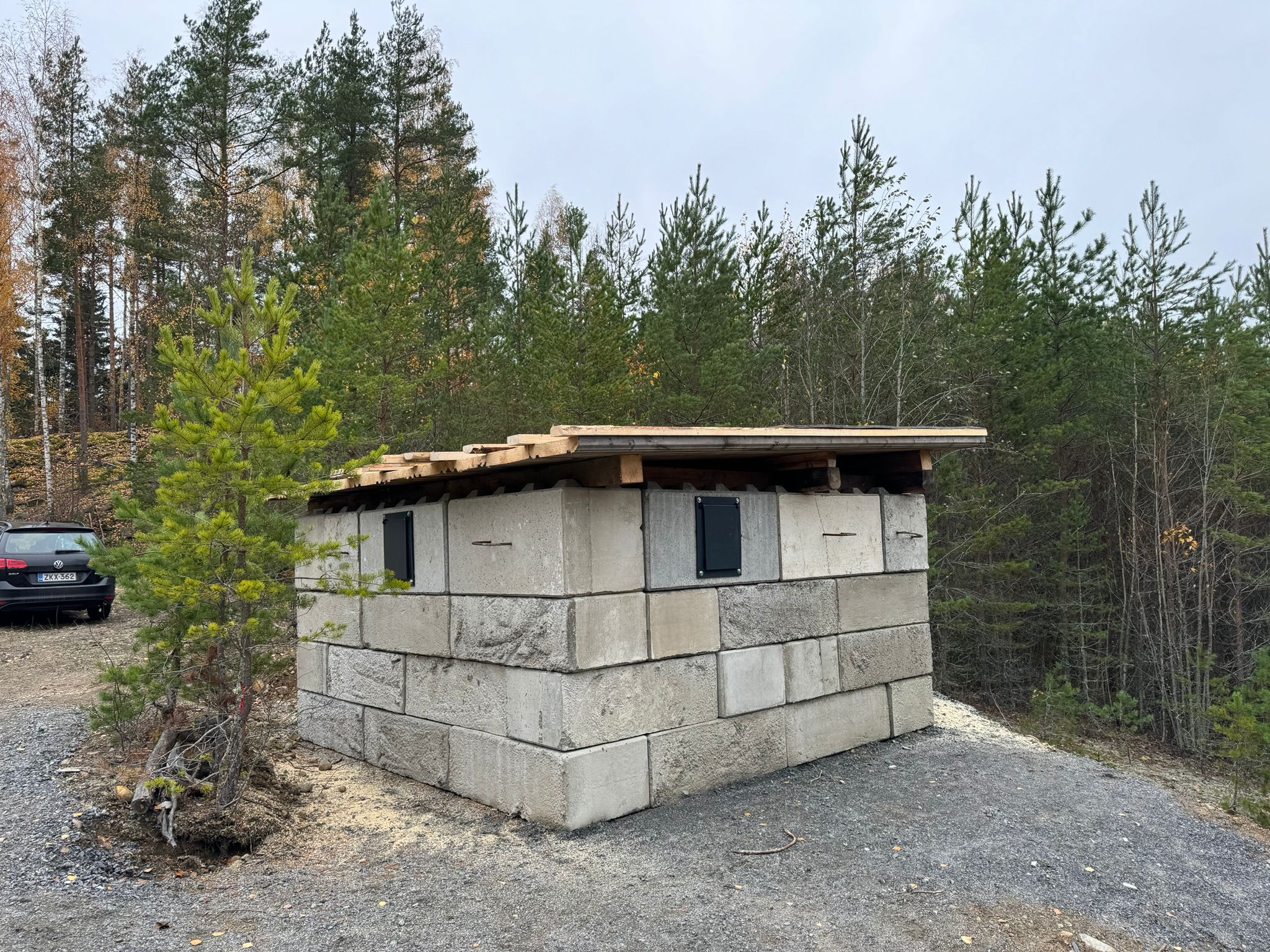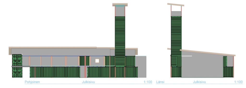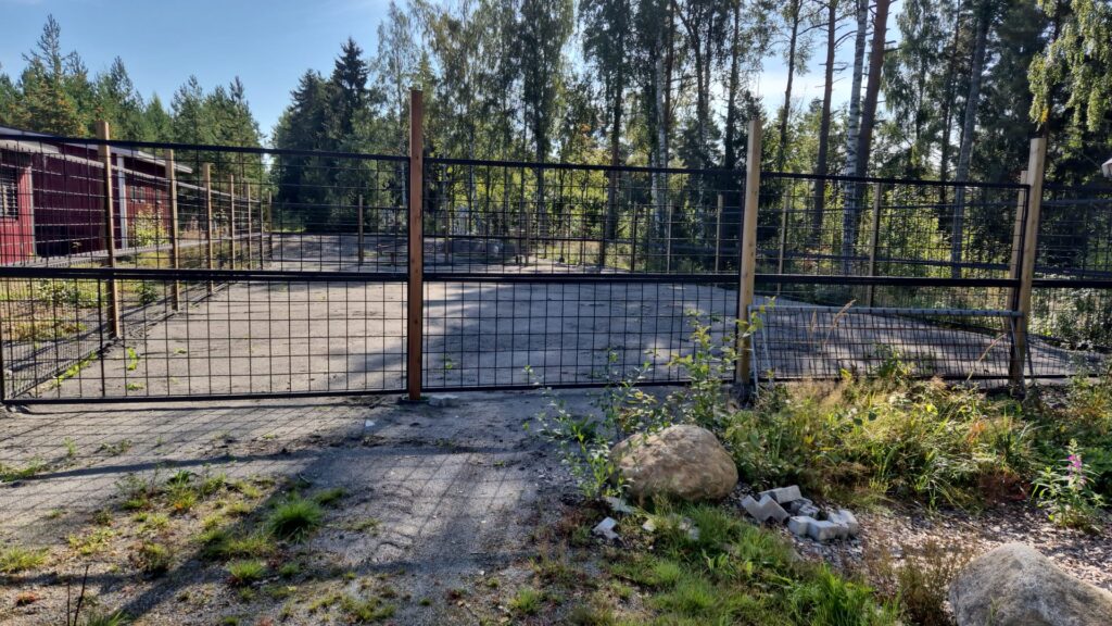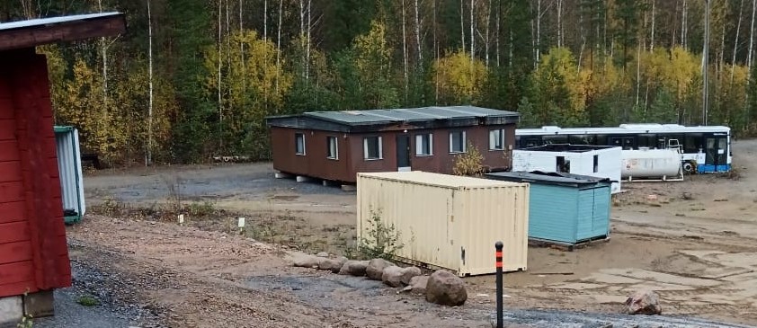 - Konttien välissä on polttopuuvarasto ja alueen jäteasema.