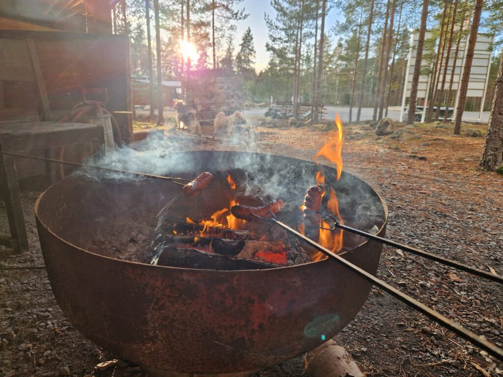 - Laavulta löytyy makkaratikkuja, pannuja ja lipan alta myös lisätuoleja