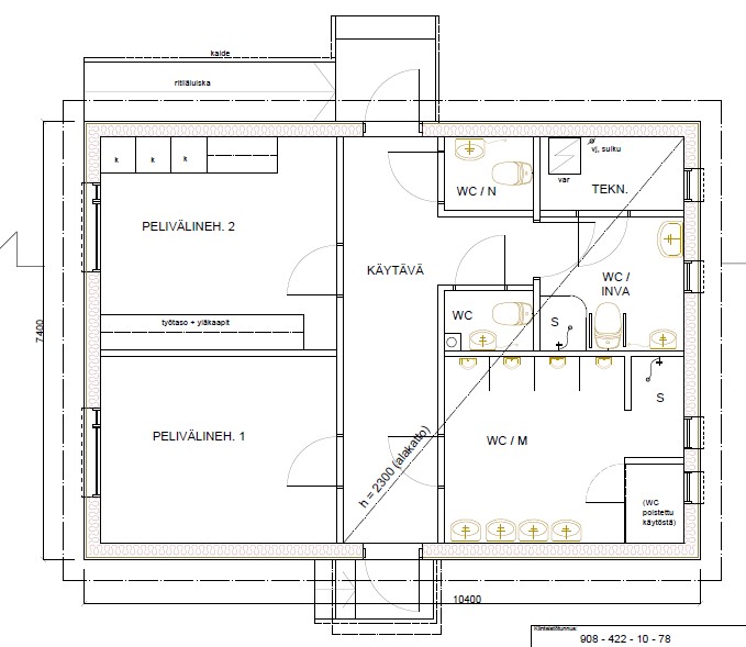 Yksi WC on inva-mitoitettu ja rakennukseen pääsee myös inva-rampista.
