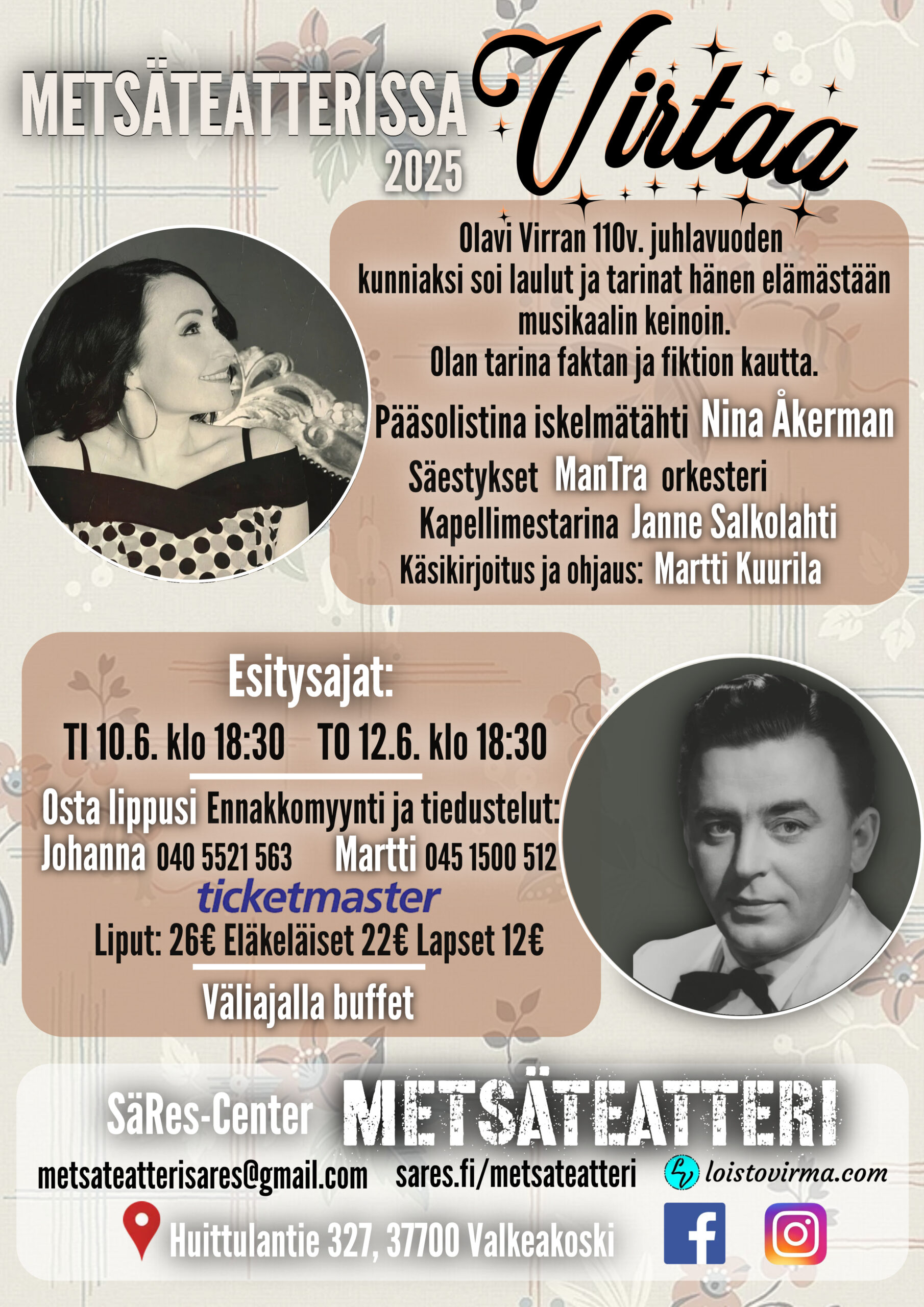 “Metsäteatterissa Virtaa” (Loistovirma oy)Ti 10.6.2025 klo 18:30 – 20:30 To 12.6.2025 klo 18:30 – 20:30Metsäteatterissa soi Olavi Virran 110v. juhlavuoden kunniaksi laulut ja tarinat hänen elämästään musikaalin keinoin. Ne Olan laulamat